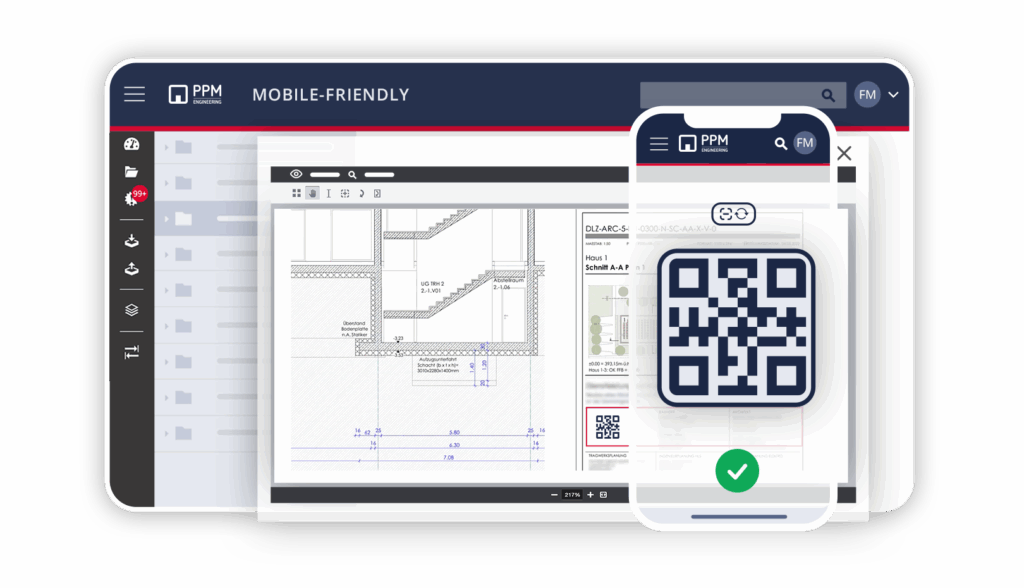 Scan onze QR-code op uw plannen en laat de PPM Raum controleren of u de nieuwste planningsstatus heeft. Zo kunt u er zeker van zijn dat er altijd volgens de meest actuele plannen wordt gebouwd.