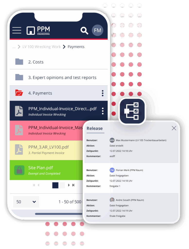 Aan alle verwachtingen van de opdrachtgever met betrekking tot kosten, kwaliteit en termijnen voldoen, is een grote uitdaging. Digitale processen voor factuur-, meerwerk- of plangoedkeuringen verminderen de foutenmarge en besparen tijd – en geld. Een willekeurig aantal externe deelnemers (bijv. experts, controllers), die slechts kortstondig bij het project betrokken zijn, kunnen op elk moment moeiteloos worden geïntegreerd.