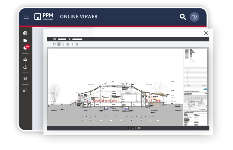 U kunt zowel plantekeningen als documenten direct in de browser bekijken, zonder download, installatie van extra software of licenties. De PPM Raum ondersteunt daarbij meer dan 350 actuele bestandsformaten. Uiteraard ook bruikbaar op mobiele apparaten (smartphone/tablet).