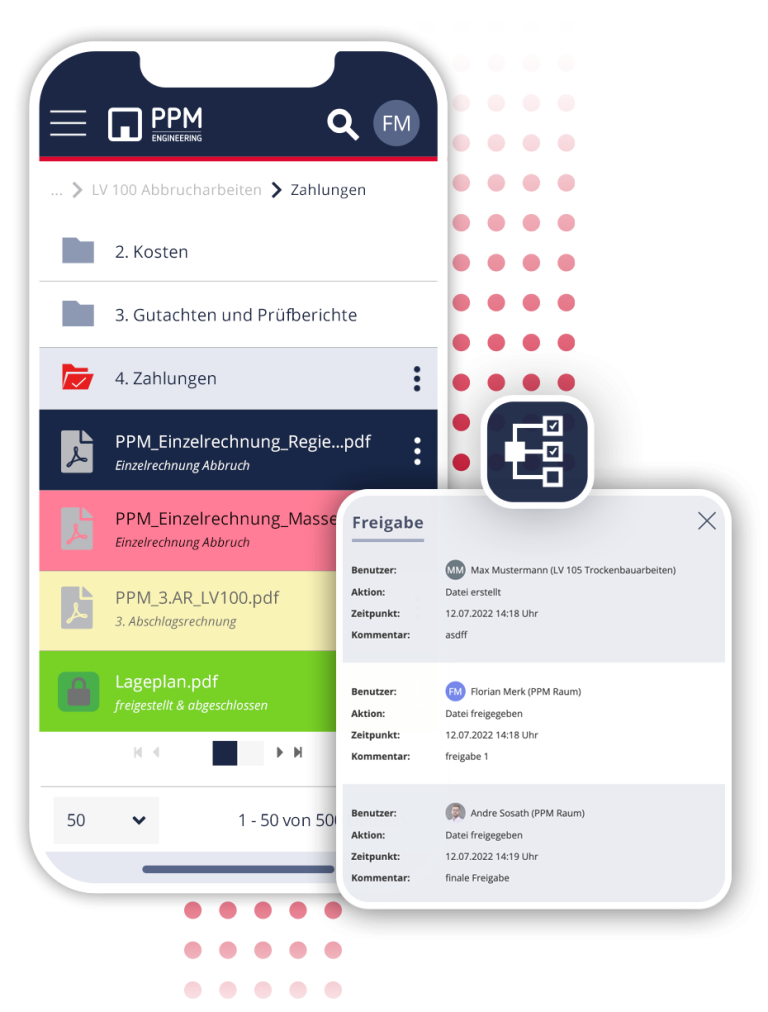 Individuele, digitale goedkeuringsprocessen voor facturen, aanvullingen of plangoedkeuringen kunnen na overleg worden geïntegreerd. Tijd- en foutpercentagevermindering door standaardisatie van processen. Eenvoudige integratie van een willekeurig aantal externe deelnemers (bijv. experts) die slechts kortstondig bij het project betrokken zijn.