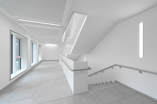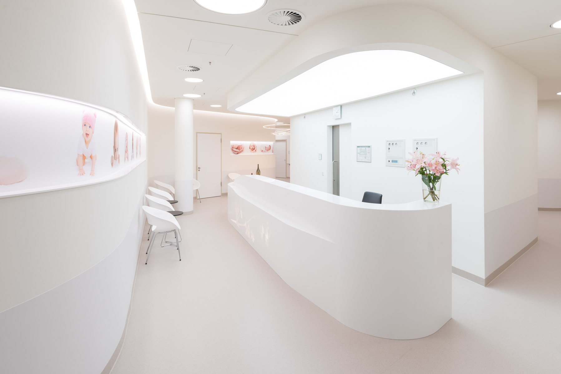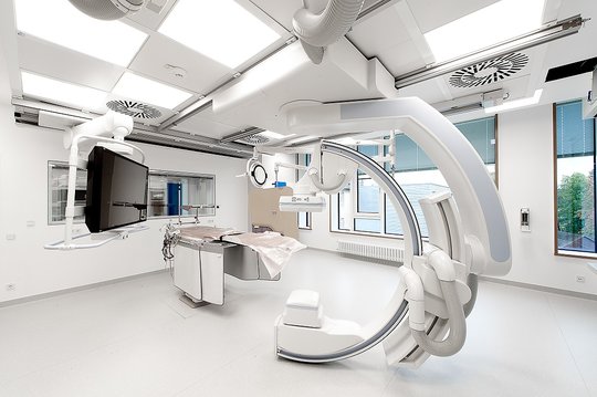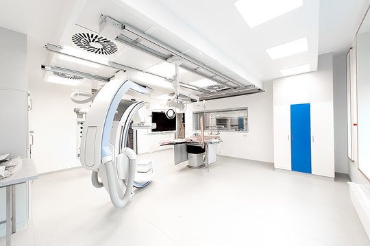 Ultramoderne onderzoeks- en behandelruimtes worden compact samengebracht in een tweelaags functioneel gebouw. Hier bevinden zich, verdeeld over twee niveaus, de centrale spoedeisende hulp, de centrale electieve opname, een intensive care, zes operatiekamers evenals de endoscopie, radiologie en andere diagnostische faciliteiten. De administratie en de medische dienst worden ondergebracht in een vier verdiepingen tellende vleugel die zich in het noorden aansluit. Licht verhoogd op een plateau vormt het het nieuwe adresgebouw van de kliniek. Via een omlopende, grote buitentrap bereikt men via het ruime entreeplein de hoofdingang en daarmee de twee verdiepingen tellende, met daglicht doorstroomde entreehal. Met de cafetaria als openbare voorziening in de sokkelverdieping ontstaan er stedelijke kwaliteiten op het entreeplein.